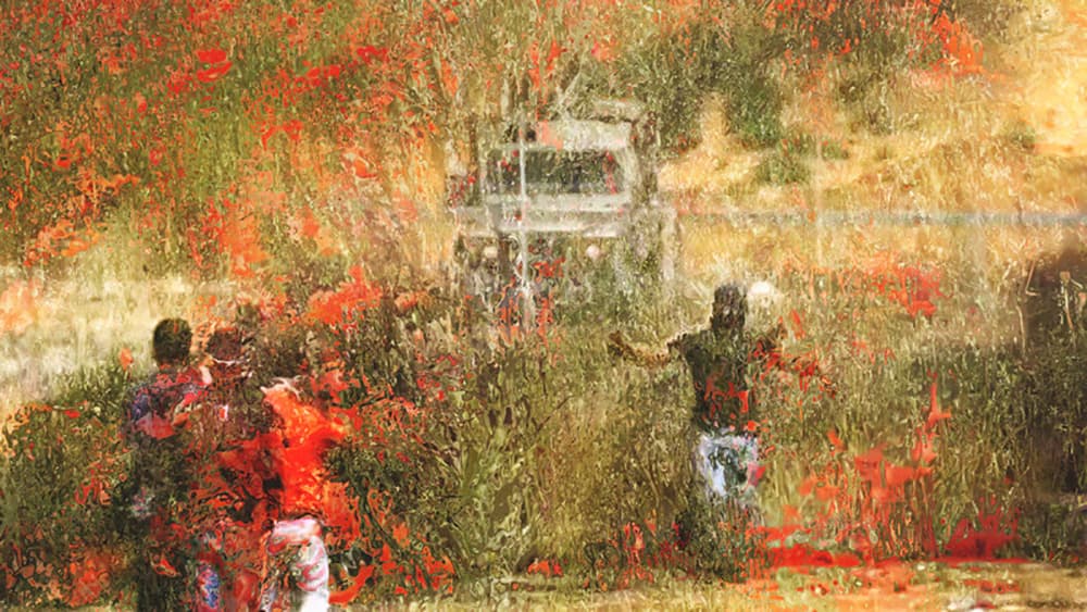 Inspired by Renaissance paintings and contemporary news broadcasts from Gaza protests - the work processes human gestures and figures in landscape into a dark and colourful scramble. An array of reflections, including concerns about the political image, image of the political, the politics of the image, and the image of image.