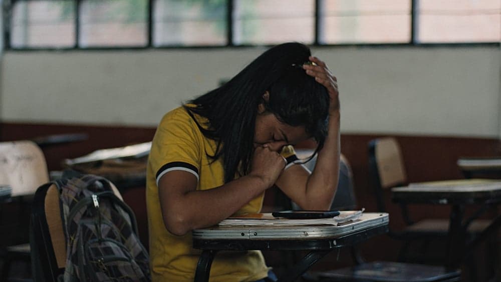 An english listening test takes place inside a small classroom while a typhoon brews outside. The students struggle to focus between the test recording and what happens beyond the test.