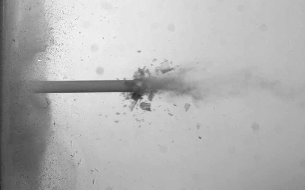 A fluorescent bulb is shot from a cannon at high speed against a wall. At 3,000 frames per second and in its last moment, it can finally shed its inner light.