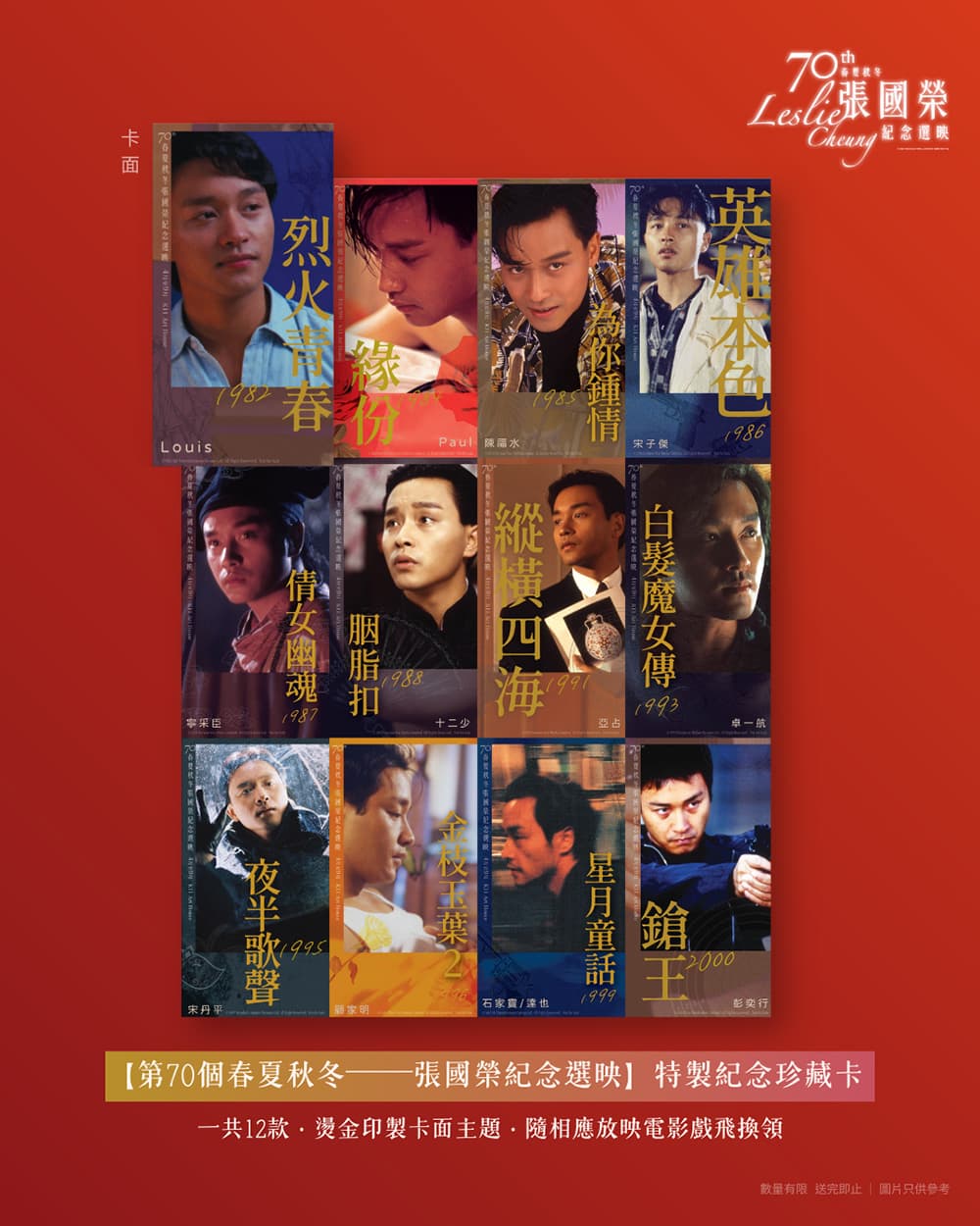 為迎接2026年9月「哥哥」張國榮的70歲誕辰,MCL 院線 K11 Art House 特別策劃「第70個春夏秋冬-張國榮紀念選映」 。放映活動將由4月起一直延續至9月,首先由上映40週年的 英雄本色 4K 修復版開始,共選映 烈火青春、胭脂扣、鎗王 等12部銀幕傑作 。影迷憑票可換領燙金印製的「紀念珍藏卡」,集齊全套12款更可拼湊出主題視覺圖案 。4月至6月場次門票現已開售,而7月至9月場次將於2026年5月開始發售 。